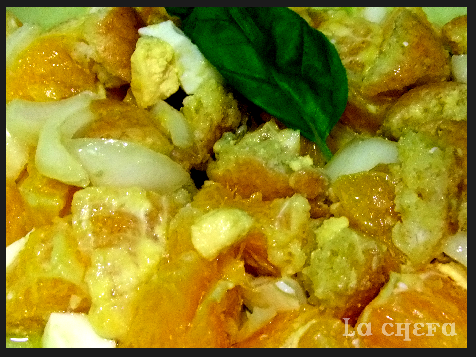 Mientras el huevo se enfría, pelar y trocear la naranja, ponerla en un plato hondo.