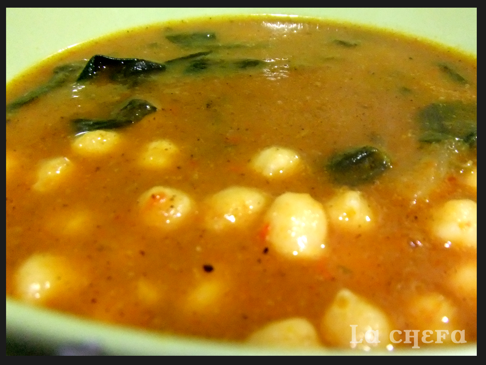 Añadir el caldo de verduras y triturarlo con el sofrito. Dejar hervir unos 10 minutos, pasado ese tiempo, agregar los garbanzos escurridos y dejarlo cocinar otros 5 minutos más.