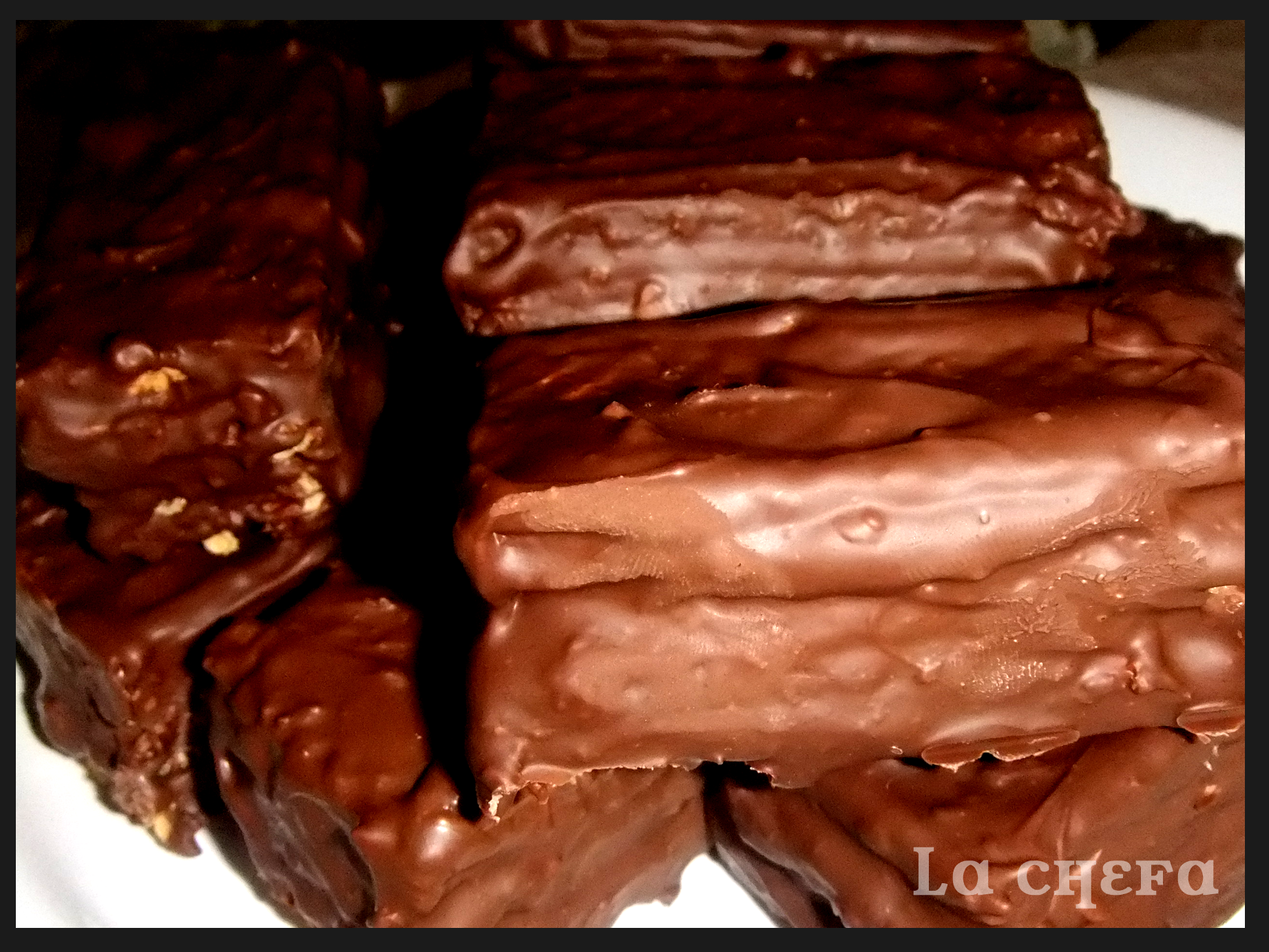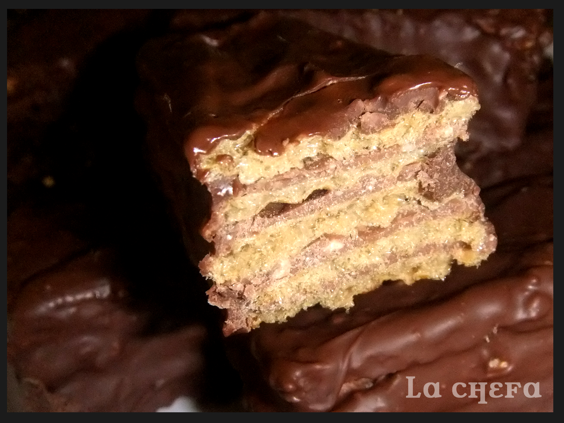 En una tabla poner cinco galletas de helado y cubrir con una poca mezcla de chocolate, poner encima otra galleta, chocolate,… Así hasta acabar con una quinta lámina de galleta.