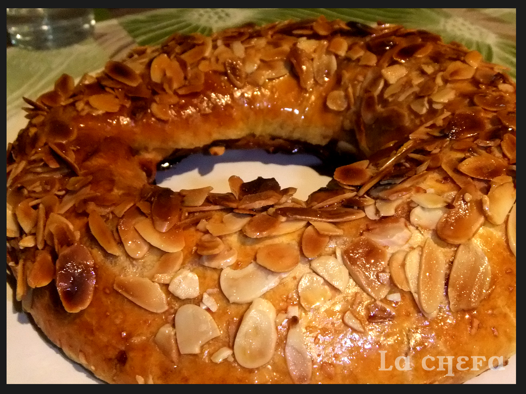 Batir el otro huevo y pintar el rosco. Decorar con la almendra laminada.