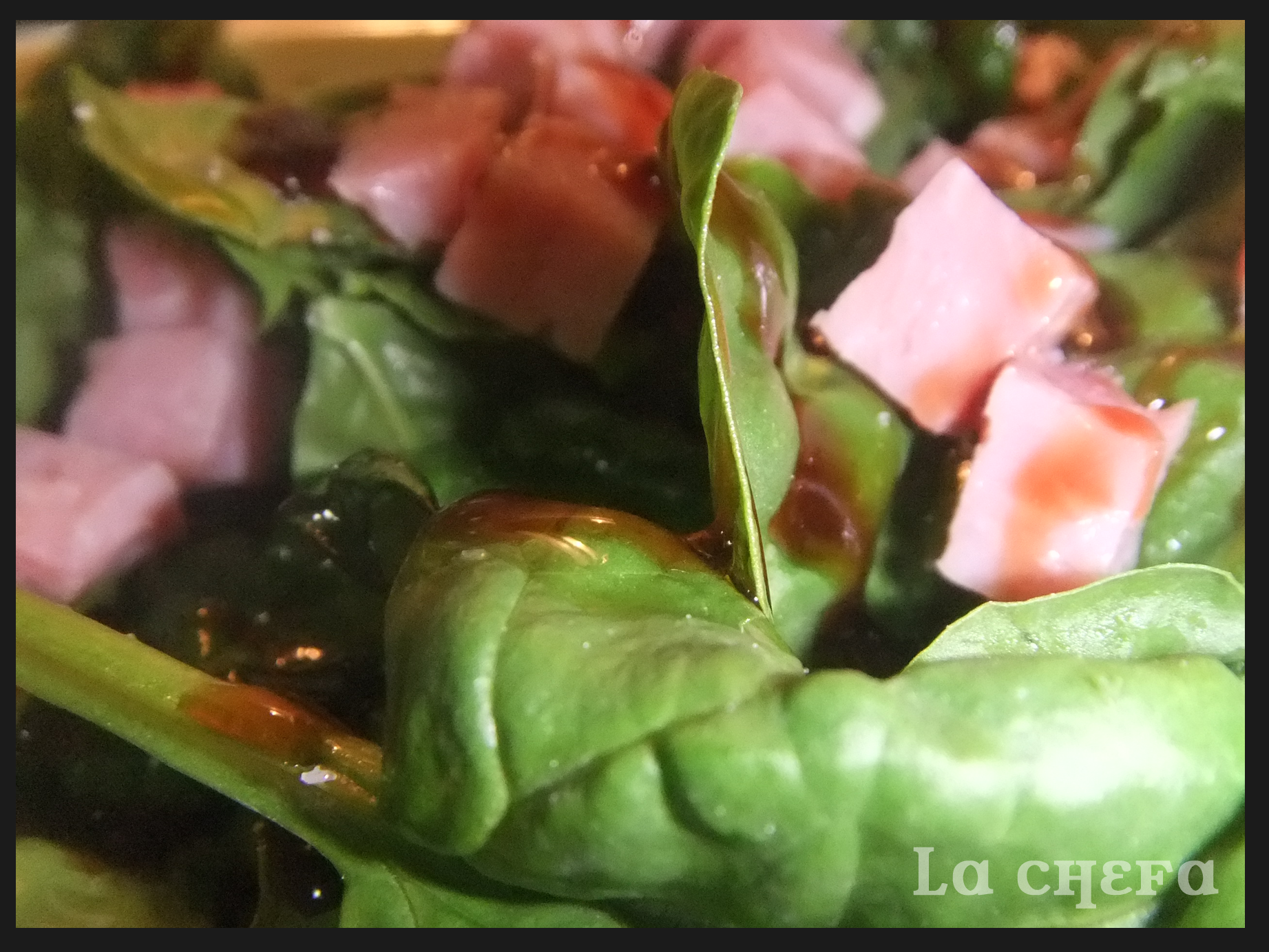 Poner en una ensaladera o plato hondo las hojas de espinacas (yo las compro en bolsa ya limpias y troceadas).