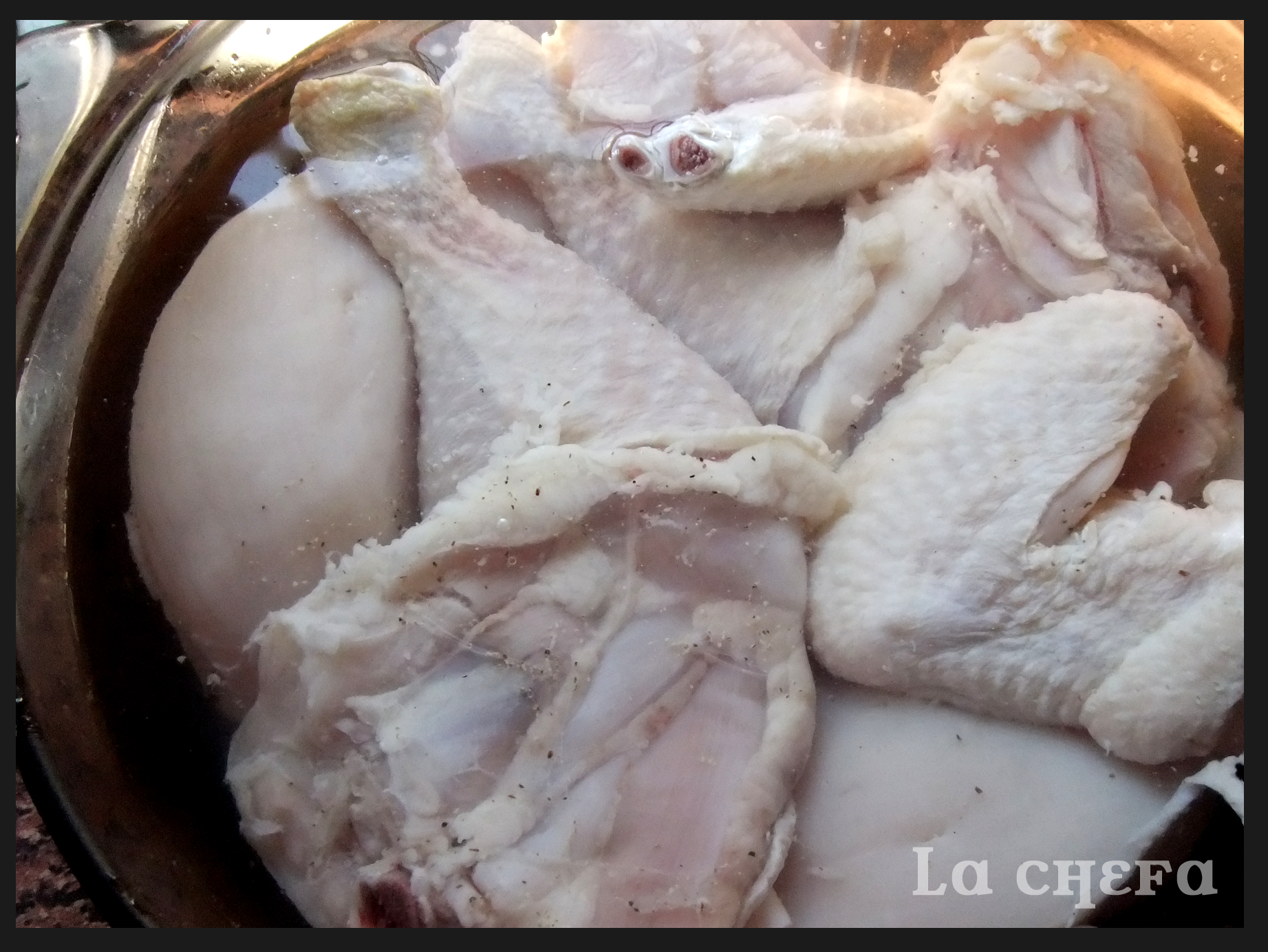 Yo lo que hago es separar las piezas del pollo, aunque se puede comprar por piezas según lo que guste a cada uno. Ponerlo en una fuente o tupper con bastante profundidad y cubrirlo con agua con una concentración de sal entre un 3% y un 8%. Yo para un pollo le pongo 3-4 cucharadas pequeñas de sal; para que se disuelva bien la pongo en medio vaso de agua y la caliento en el microondas, después lo incorporo al pollo con agua.