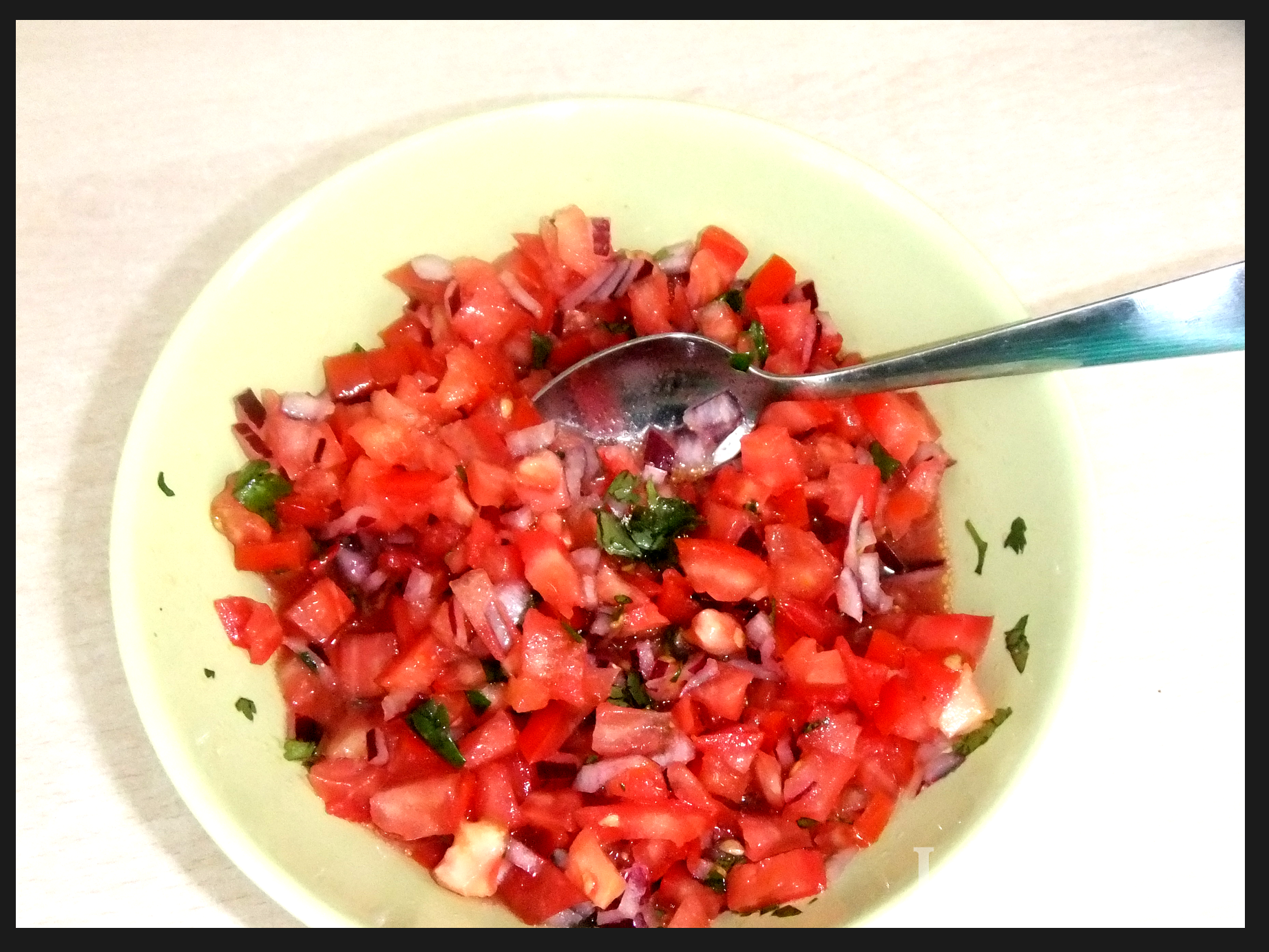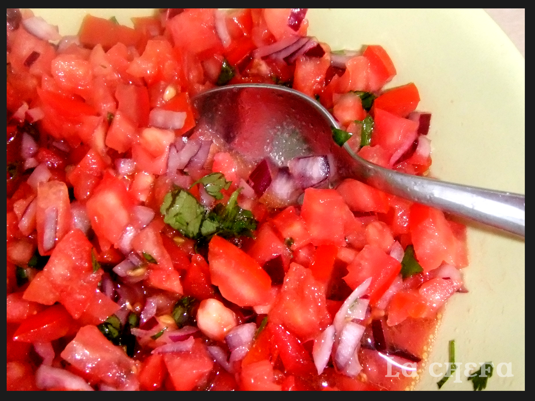 Pelar la media cebolla y picarla en pequeñito. Añadirlo al tomate.