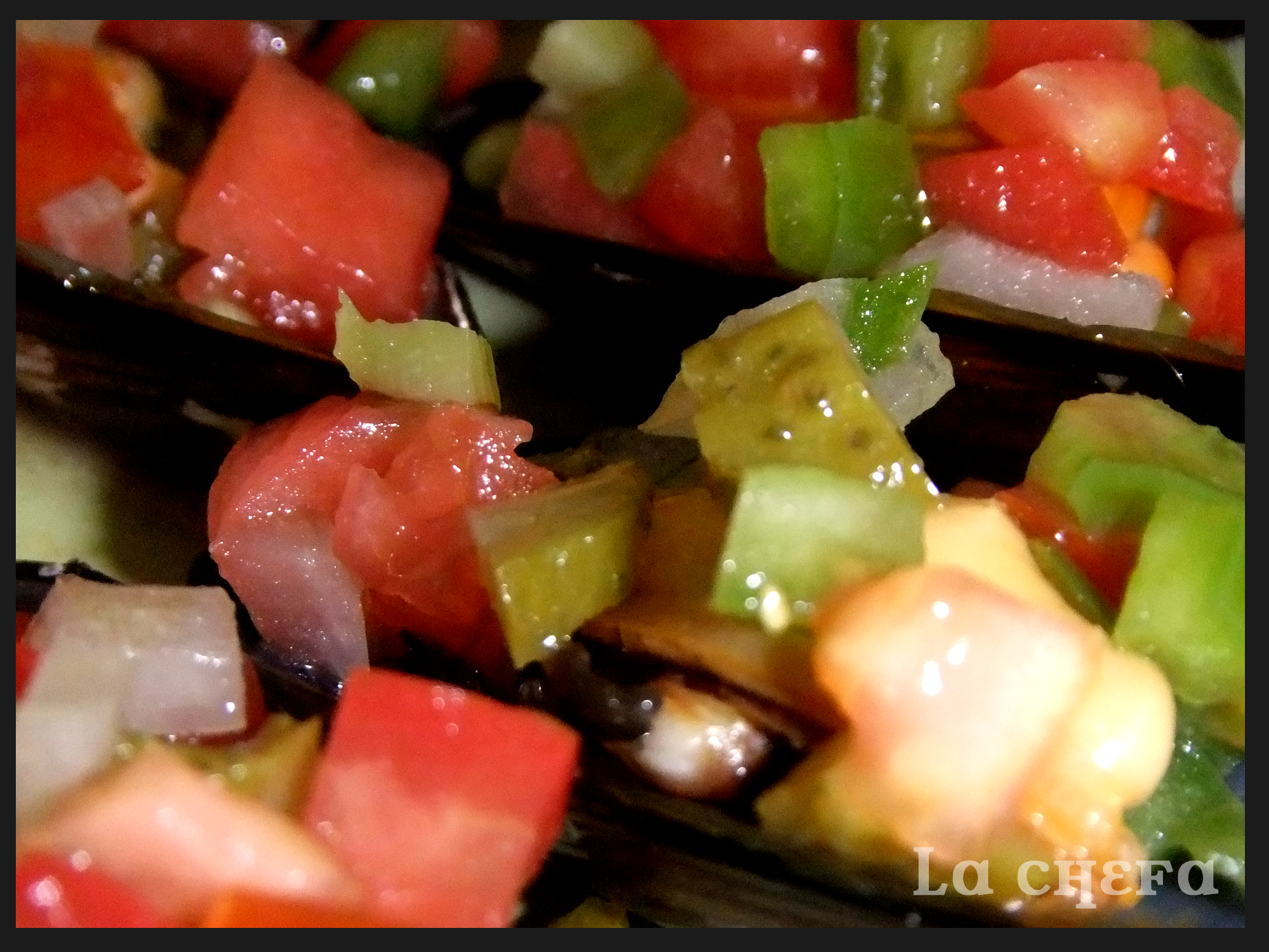 Mientras hacer la vinagreta. Lavar el tomate y el pimiento y pelar la cebolla, picarlo todo en pequeñito y ponerlo en un bol. Picar también los pepinillos y agregarlos al bol. Añadir un chorrito de aceite de oliva, un buen chorro de vinagre y sal. Mezclar muy bien.