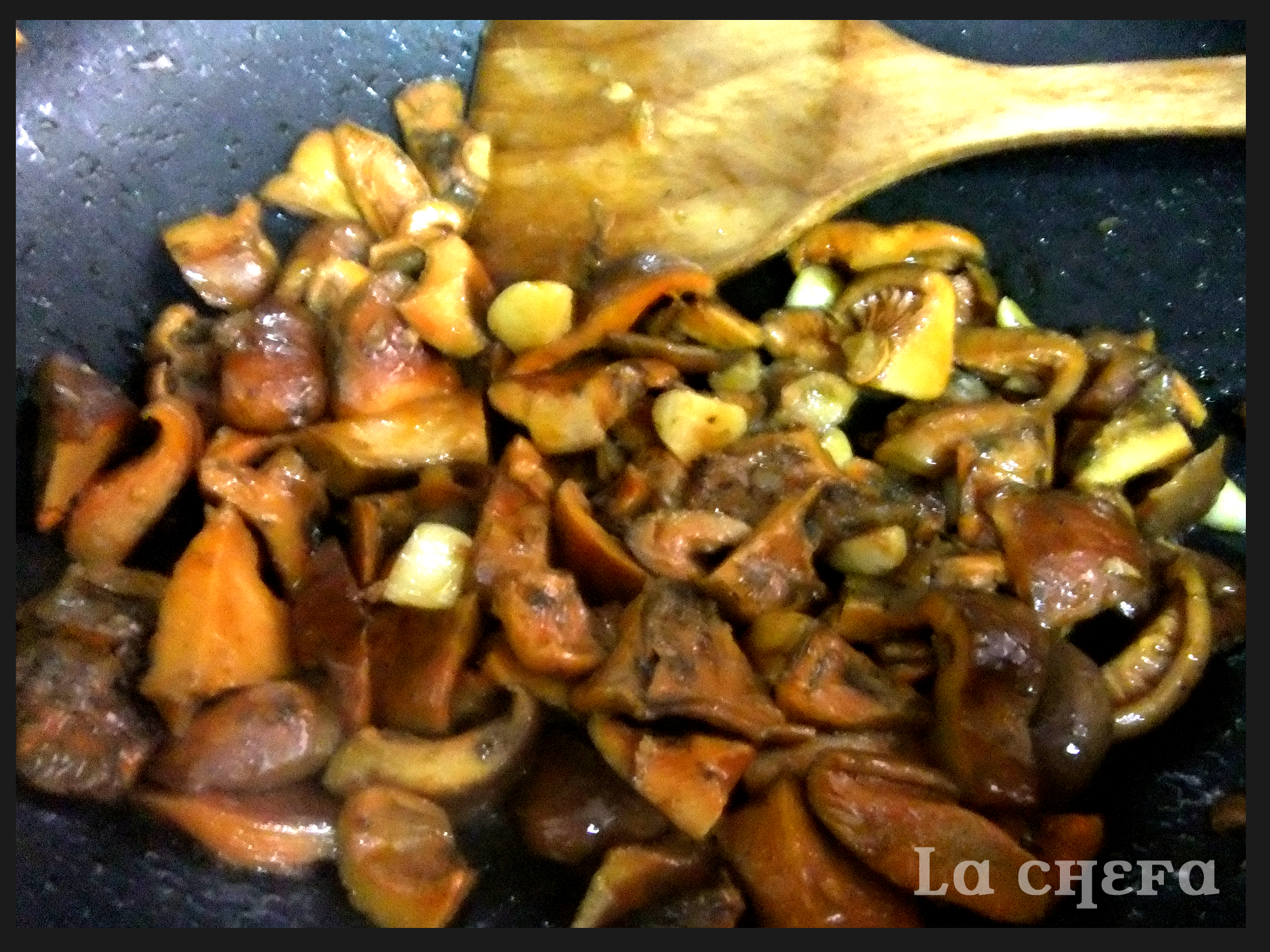 En una sartén, poner un chorro de aceite de oliva y los dientes de ajo. Cuando empiecen a dorar, incorporar los níscalos y un poco de sal. Dejar que se vayan salteando, el tiempo dependerá de cómo os gusten, si más tiernecitos o más enteros.