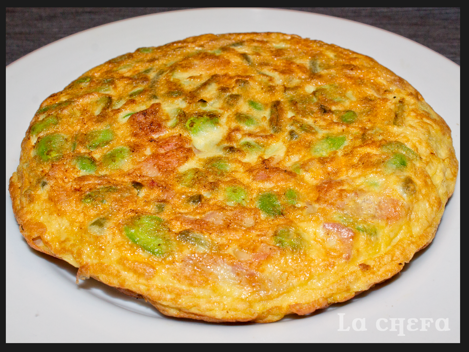 Ésta es una tortilla de temporada de habas que, si bien suele preparase de habas y jamón, en esta ocasión la quise elaborar dándole sabores nuevos. Y esos sabores los conseguí gracias a los porrines y al bacon.