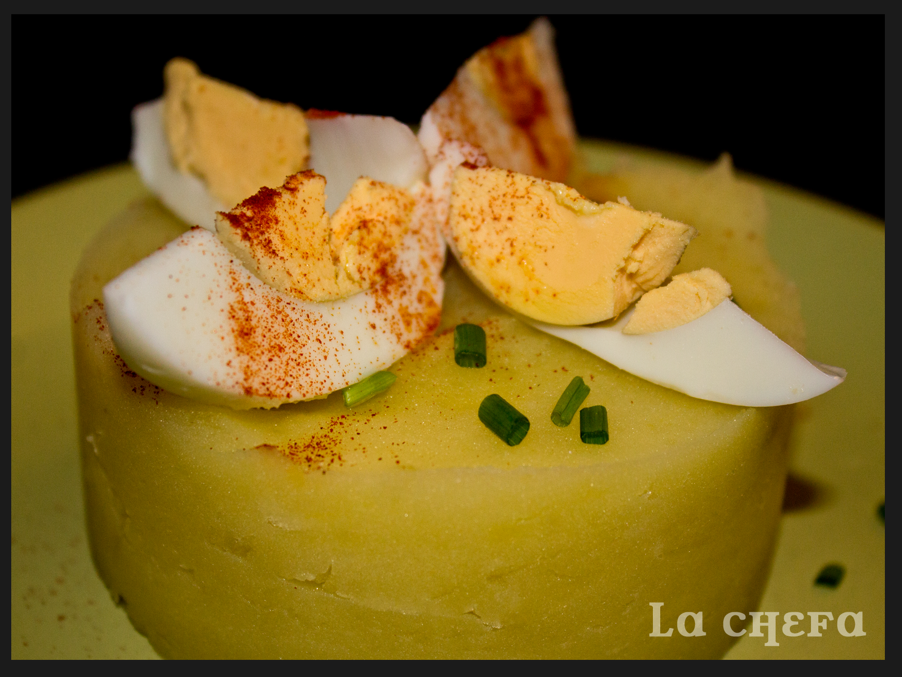 Servir el puré de patatas con el huevo duro, un chorrito de aceite de oliva y una pizca de pimentón. Podéis decorarlo con un poco de cebollino picado que, además, le aportará un sabor extra.