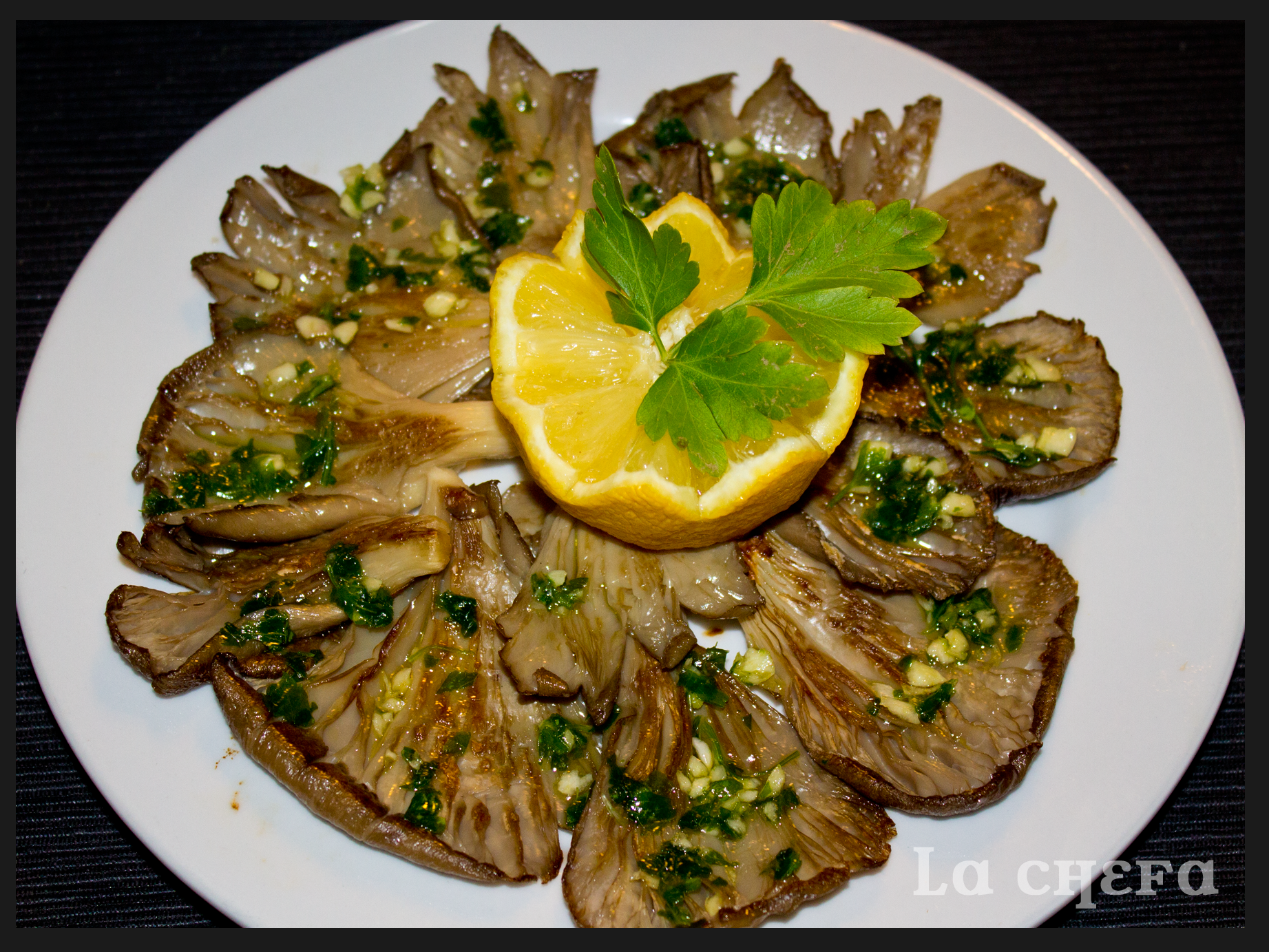 Cuando las setas estén listas, servirlas en un plato y repartir sobre ellas la mezcla de perejil y ajo. Acompañar con limón.