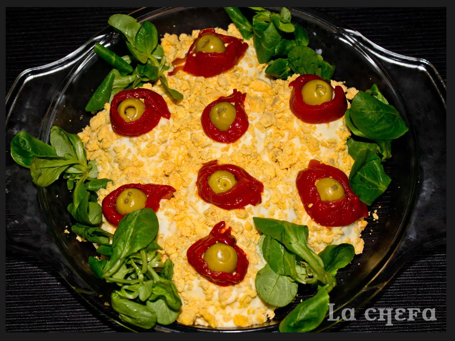 Con esa mezcla, rellenar los huevos duros y ponerlos en una fuente boca abajo. Extender sobre ellos mayonesa.
