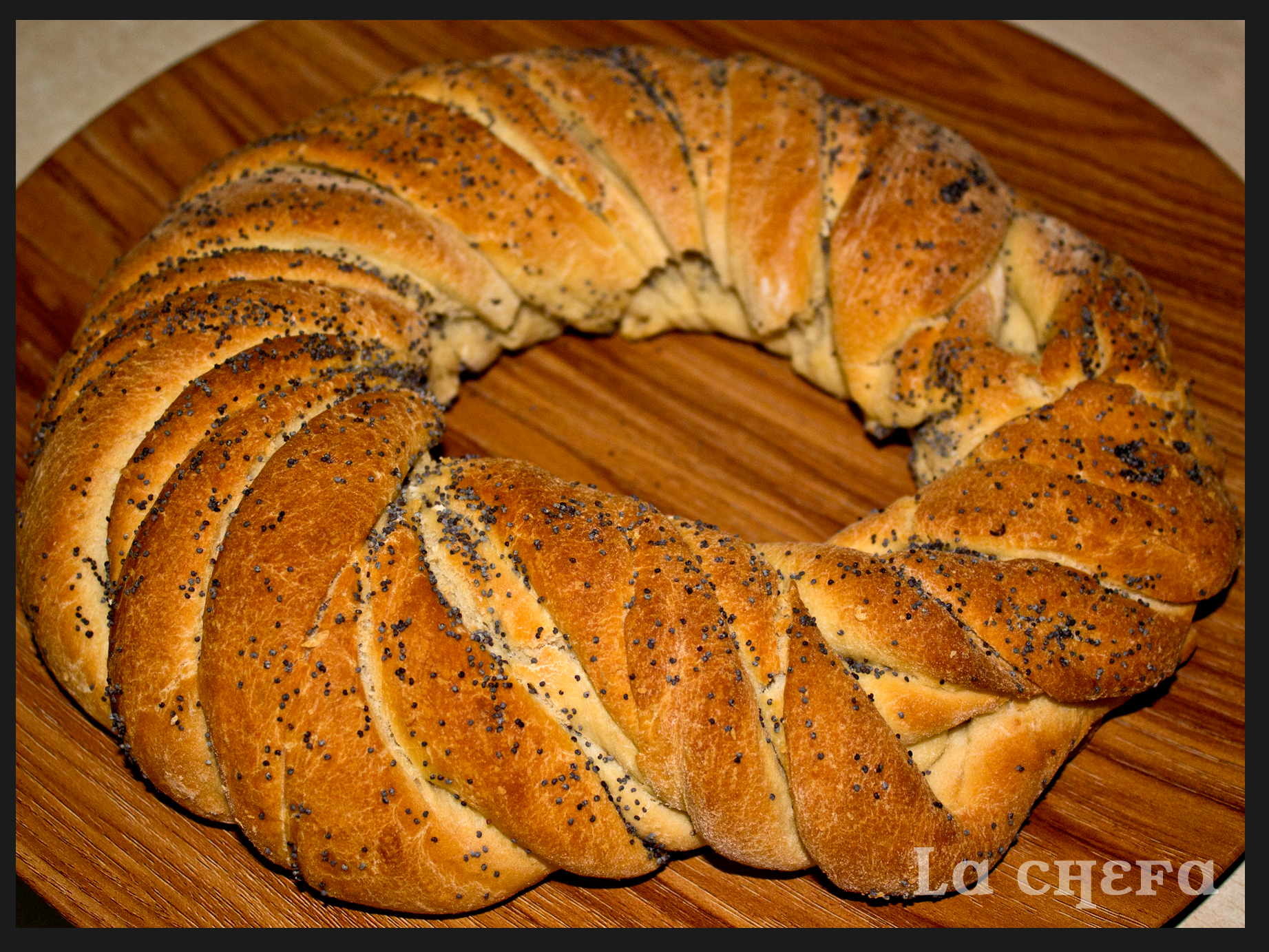 Con un rodillo, estirar la masa dándole forma de rectángulo. Cuando esté lista, pintar con una pizca de aceite de oliva y espolvorear sobre ella semillas de amapola. Ahora hay que dividir el rectángulo en seis tiras (a lo largo) y sin llegar a cortar por uno de los extremos. Girar sobre sí mismas las seis tiras dándoles forma de tirabuzones. Una vez estén enrolladas las seis tiras, hacer un gran tirabuzón con todas ellas y unir por los extremos para darle forma de rosco.