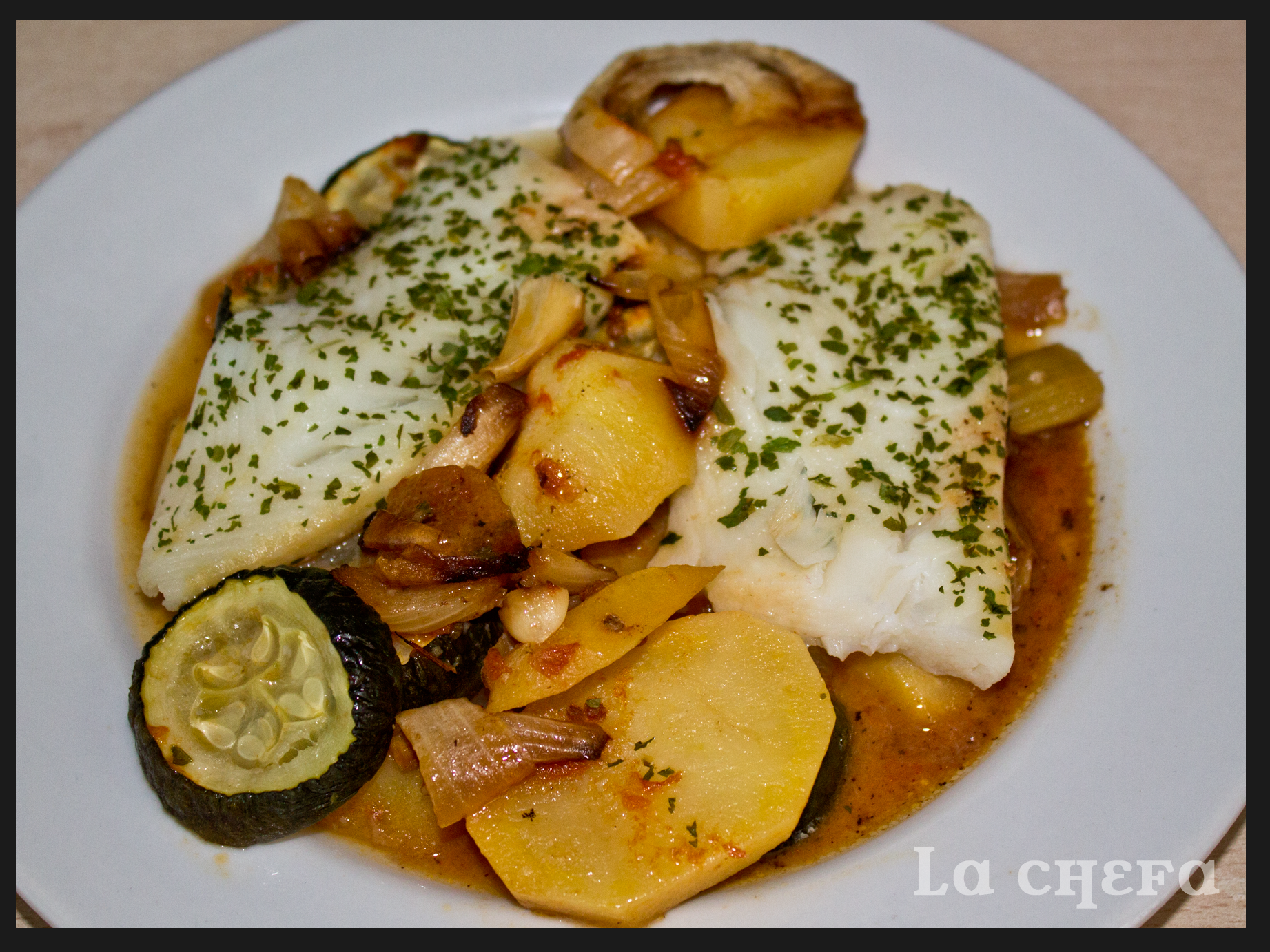Poner sal y perejil picado a los filetes de pescado y ponerlos en la fuente cuando las patatas estén listas. Meter al horno unos 10 minutos. Cuidado con que el pescado no se pase y se quede reseco.