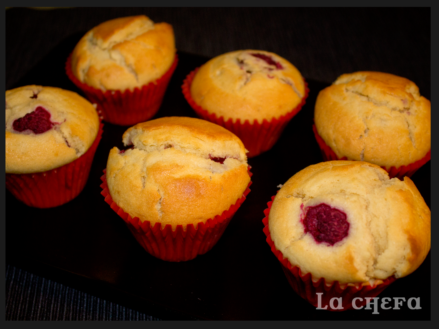 Ésta es mi primera receta de muffins y me he decantado por hacerlos con unas frambuesas que tenía en el congelador y ese sabor ácido que les aporta está espectacular.