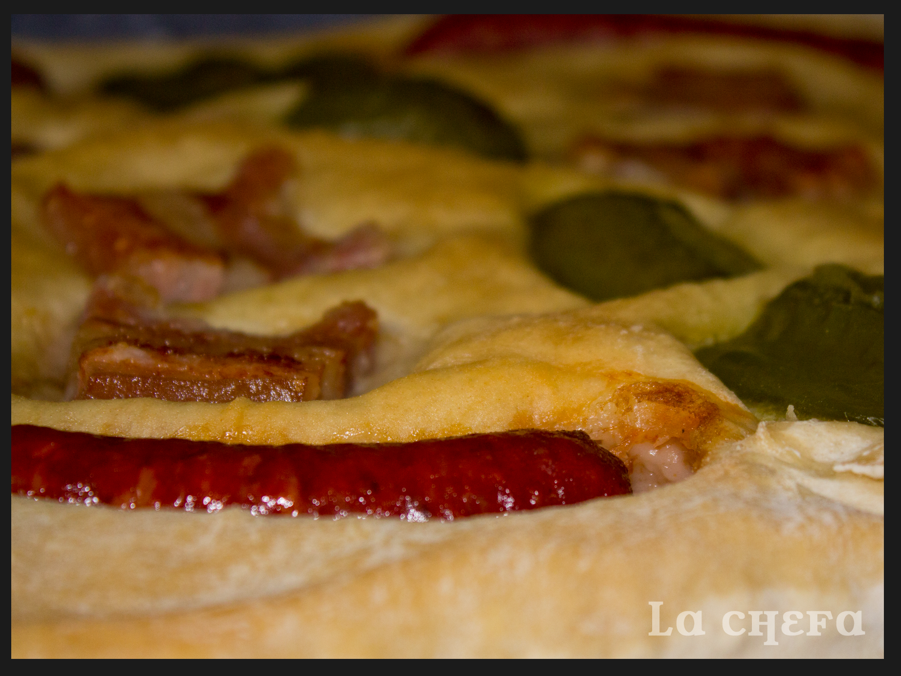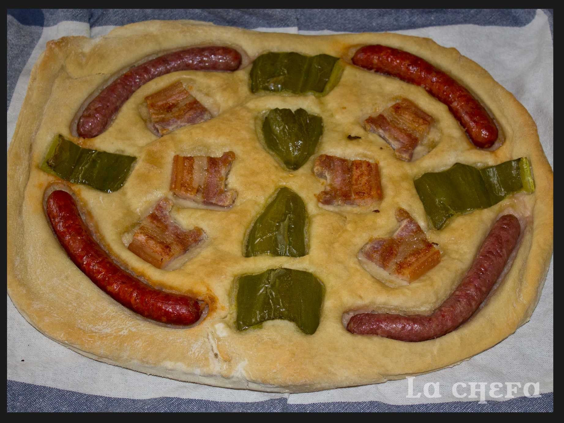 Habitualmente se hace con chorizo, panceta y pimiento aunque yo, en esta ocasión la he preparado con longanizas blancas y rojas. También es muy común encontrarla con sardinas. Sólo tenéis que adaptarla a vuestros gustos.