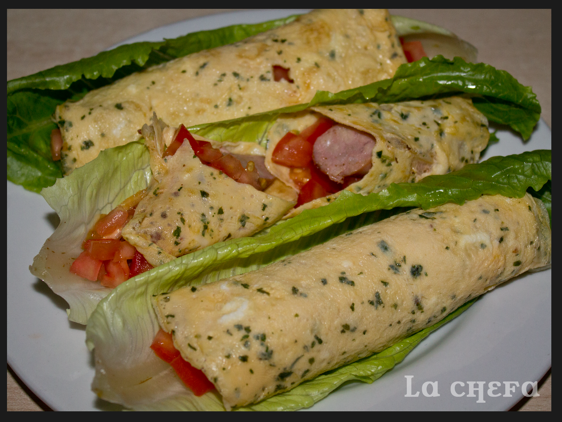 Poner un poco de tomate picado en una tortita de huevo, colocar encima una salchicha y envolver. Servir la tortita sobre una hoja de lechuga. Presentar así todas los rollitos.