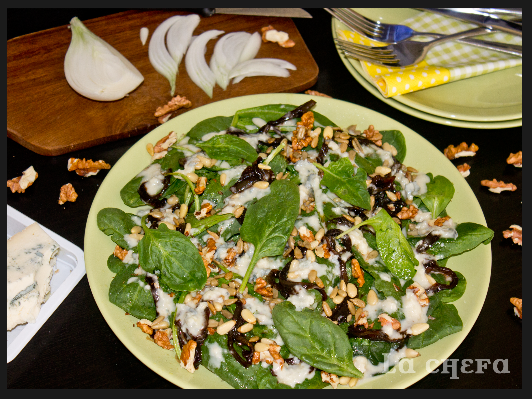 Colocar las espinacas en un plato o ensaladera. Ponerle los frutos secos, yo le he echado nueces, piñones y pipas peladas que es lo que tenía por casa pero podéis utilizar los que más os guste o que tengáis en vuestra despensa. Añadirle un poco de sal y aceite de oliva y acabar con la salsa de queso gorgonzola.