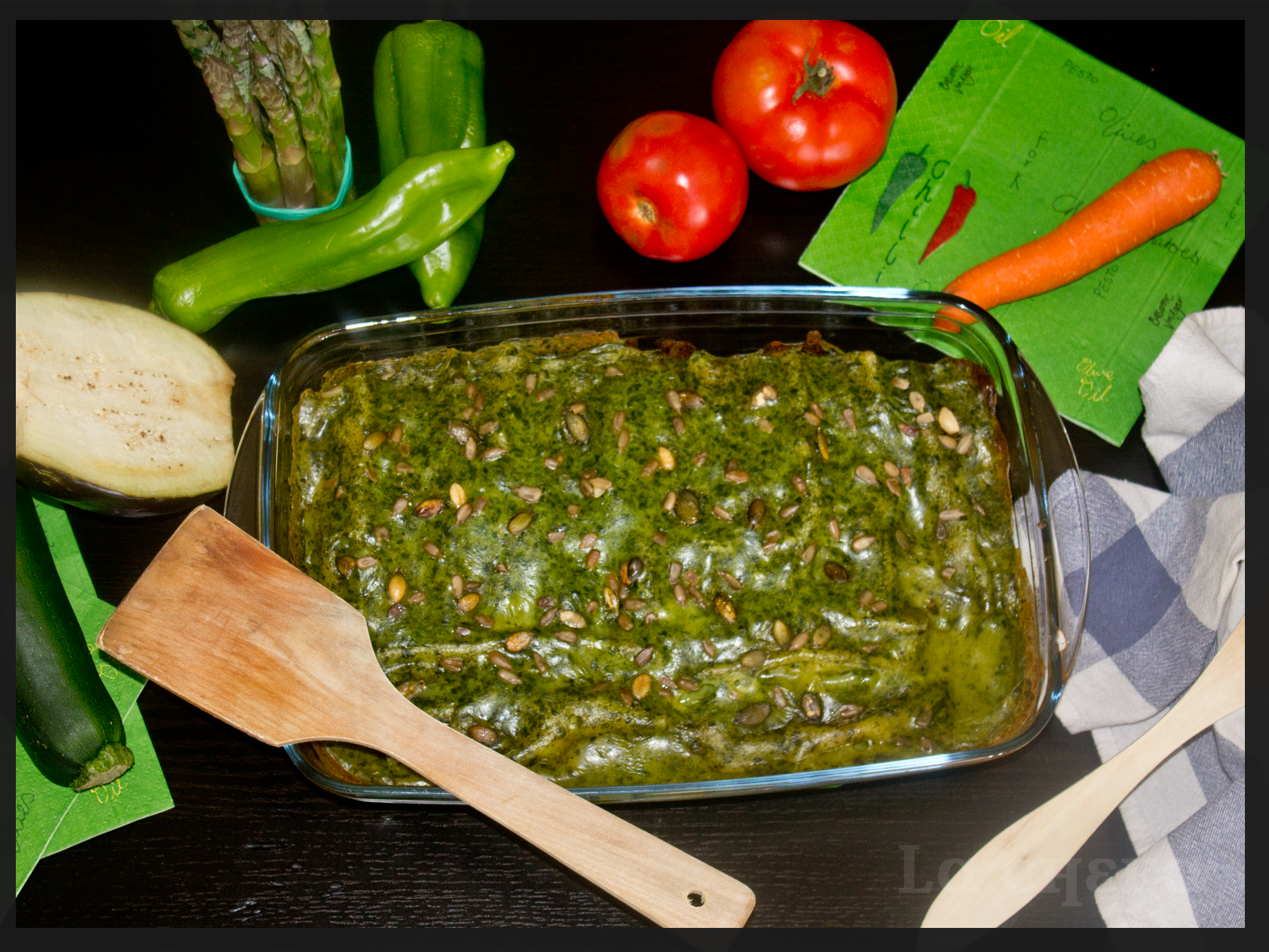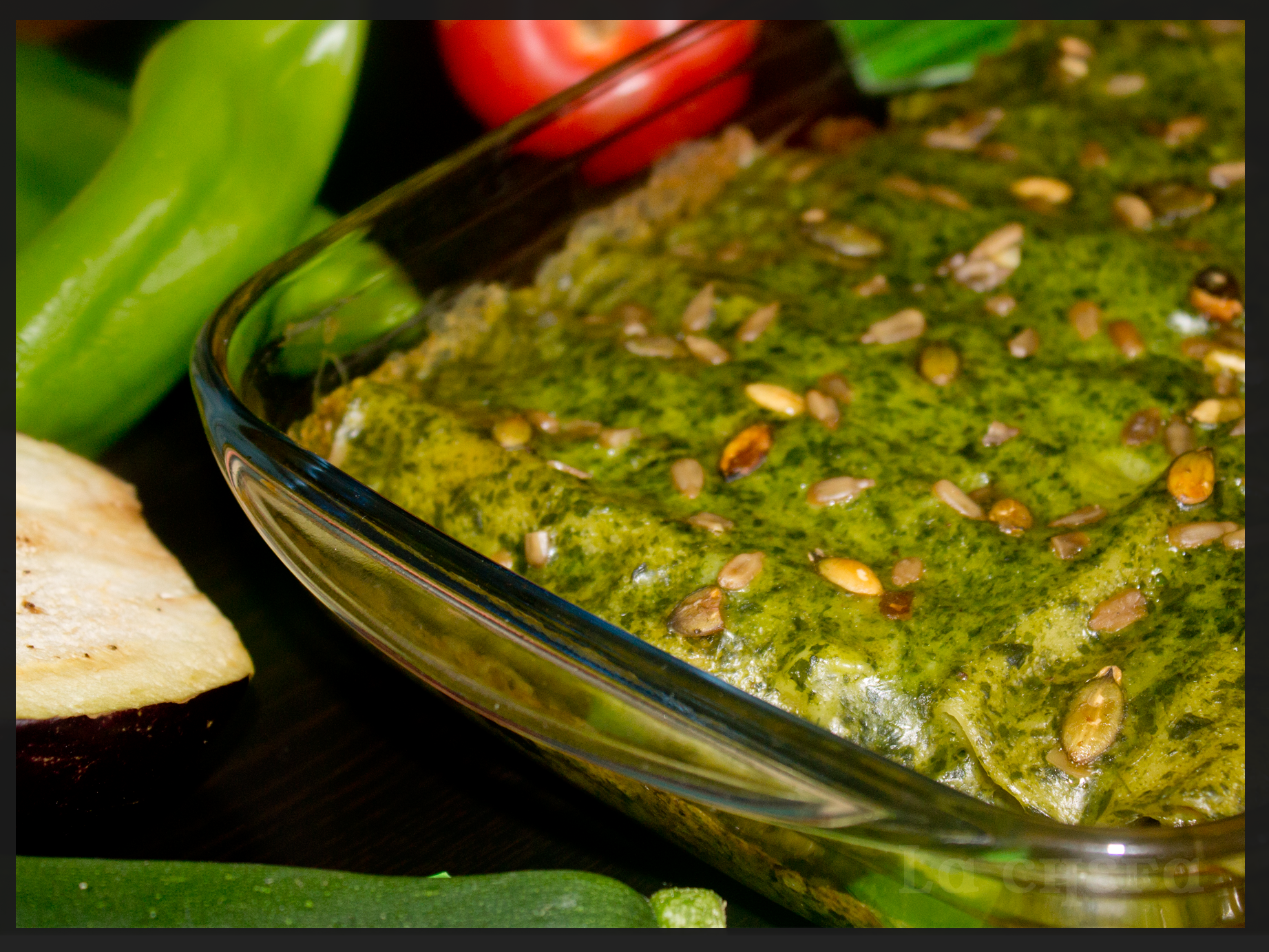 Montar los canelones con el relleno de verduras y colocarlos en una fuente apta para hornos. Cubrirlos con la crema de espinacas y decorarlos, si se quiere, con unas pipas. Meter al horno, con la función del gratinador, y dejar que se dore la salsa un poco.