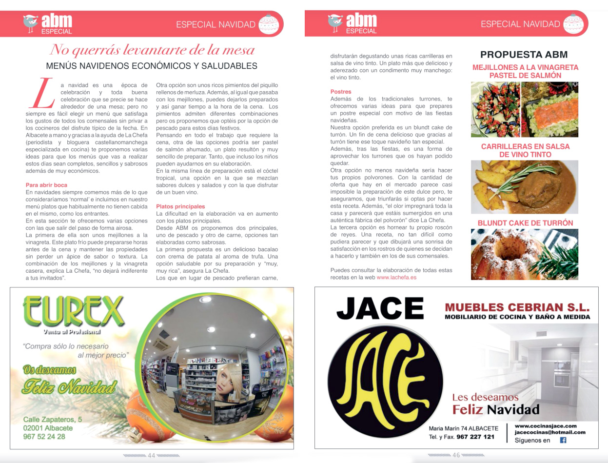 Especial Navidad «Albacete a mano» 11 diciembre, 2017 · de lachefa · en En los medios. · Comenzamos nuestra colaboración con la revista albaceteña «Albacete a mano» con un especial de Navidad en el que os proponemos unos menús para los días de fiesta. Os dejamos las páginas para que podáis verlas. Comparte esto: Haz clic para compartir en X (Se abre en una ventana nueva) X Haz clic para compartir en Facebook (Se abre en una ventana nueva) Facebook Me gusta Cargando... Relacionado